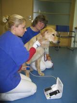 Tierarzthelferinnen bei der BD-Messung an einem Hundepatienten