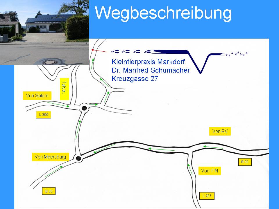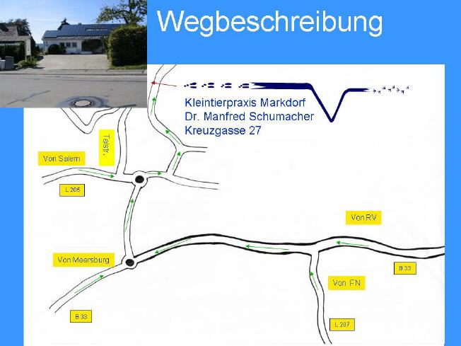 In Markdorf am kleinen Kreisverkehr geradeaus Richtung Stadtmitte bis Bäckerei Neumann, danach links in die Kreuzgasse einbiegen, folgen sie der Strasse etwa 300 m, dann links ein Schild "Kleintierpraxis Dr. M. Schumacher". Parkmöglichkeiten auf dem Hof. Praxiseingang links die Treppe hinab.